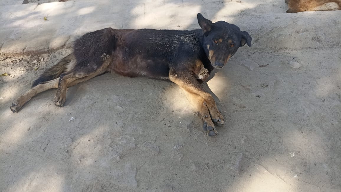 Debra had fallen into a drum of Tar. Luckily someone saw her falling and rushed to her aid. She was pulled out of the drum and was admitted to our hospital. With all this tar on her, our staff had to act fast. Tar was solidifying, uncasing her in it. It was fully stuck to her body. Just removing the tar was a big challenge. It took hours of work and to completely remove the tar, it took almost a week. Her skin was raw and she had stopped eating. First 3 days she didn't eat anything and was kept on drips, was given antibiotics and other supportive treatments. For her skin, silver nitrate cream was being applied to help her with the burning. Finally on the 4th day she started eating on her own. There was hope. Today her skin has fully healed and her blood report also came back normal. She is active also, and very friendly